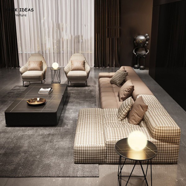 This sofa can be combined into different shapes. The sofa is fabric / velvet sofa.